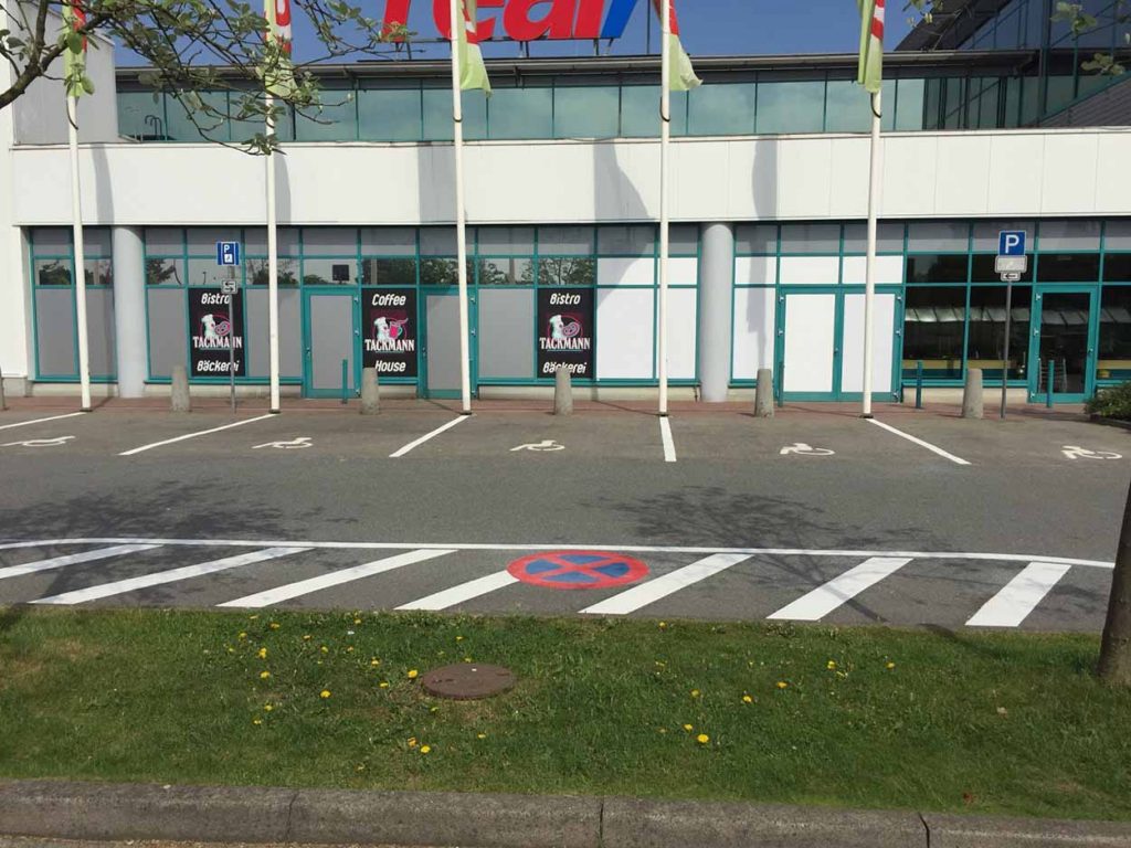 - Wir erledigen alle Vorarbeiten, wie die Entfernung bestehender Markierungen, die Reinigung des Untergrunds, die Entwicklung von Schablonen für Firmenlogos, oder die Installation von Parkplatzsperren, Fahrbahnschwellen, Pfosten, Schildern und Spiegeln.